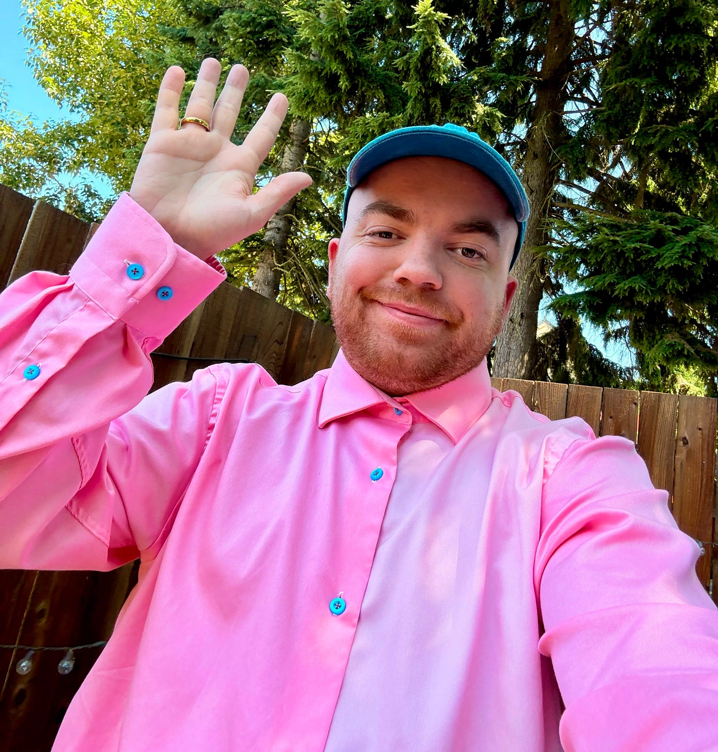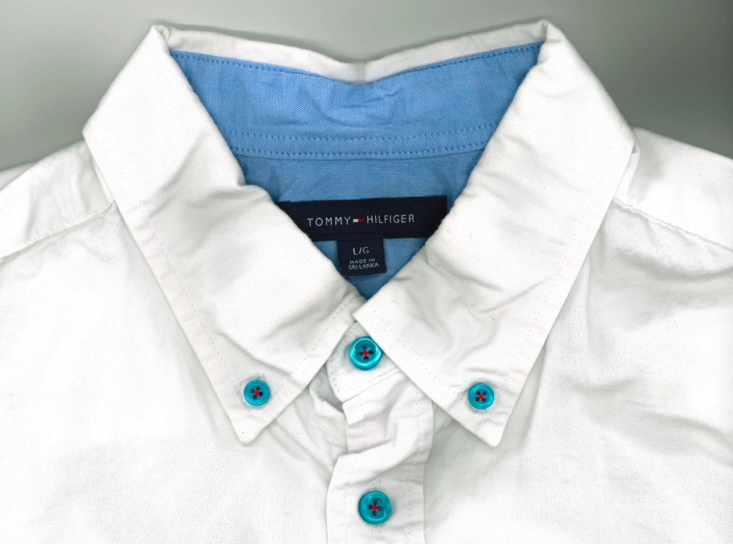 For the button-up shirt, I dyed it pink and hand-sewed the newly blue buttons back on with a contrasting red thread.